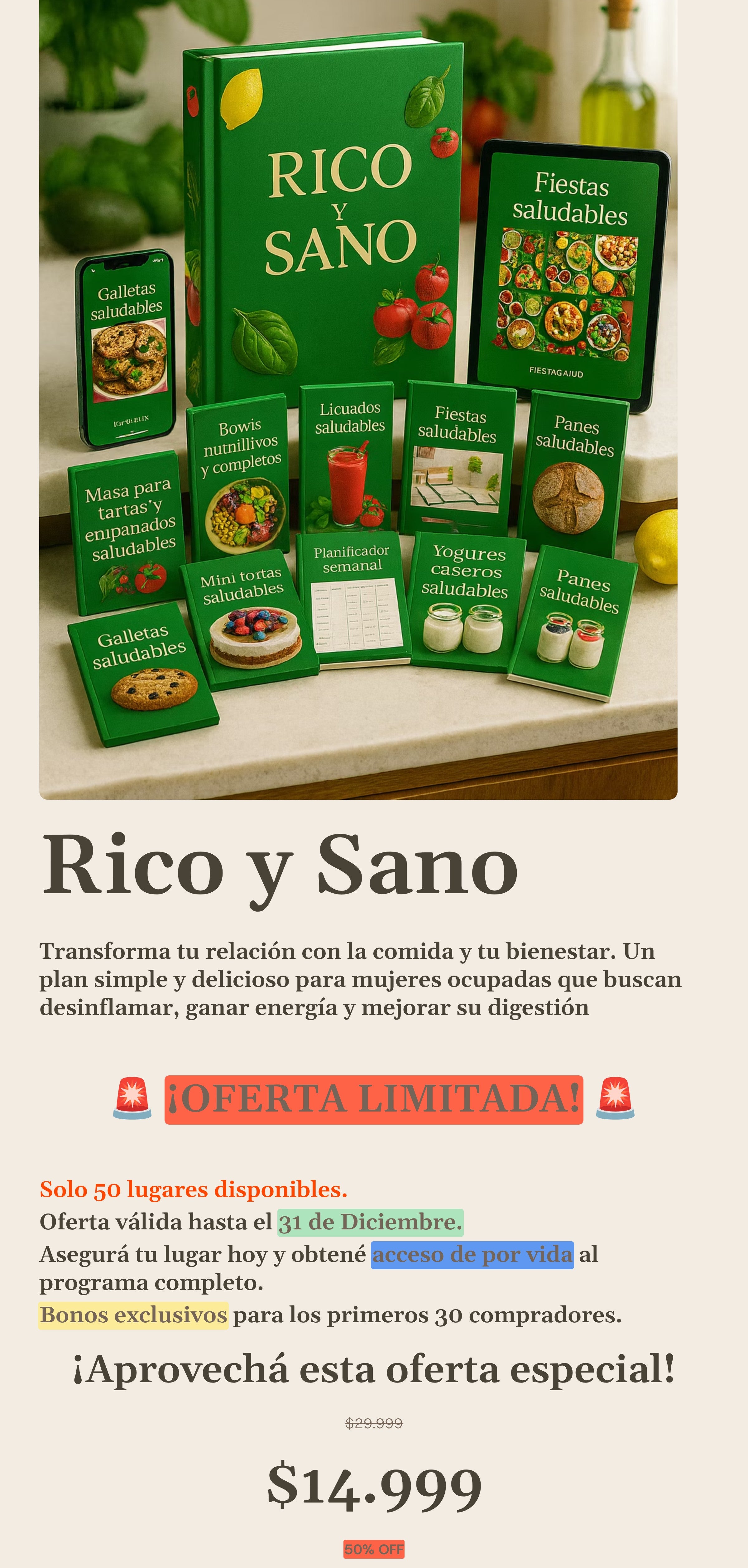 El ebook Rico y Sano está en formato PDF digital, por lo que podés leerlo desde tu celular, tablet o computadora sin necesidad de imprimirlo